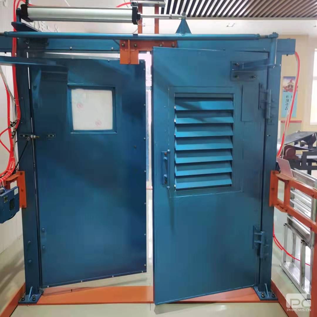 由兩道單式風門主體、一臺電控箱、兩套紅外線傳感器、兩套語音*,二個氣控箱 ,二個氣缸 ,四個防爆按鈕,一盤氣管組成