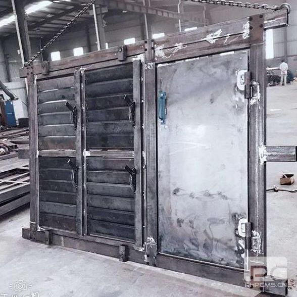 改變普通礦用自動無壓調節(jié)風門的軟件程序并且在大門扇上多開幾個推拉式調節(jié)擋板,用大氣缸或油缸控制大門扇,增加小氣缸或油缸控制調節(jié)擋板的平移動作。在自動感應器受到觸發(fā)后PLC立刻指揮小執(zhí)行裝置拉開調節(jié)風窗的擋板,卸掉壓在門扇上的壓力,然后大執(zhí)行結構才開始推動大門扇開始運轉,礦車或行人通過后,大執(zhí)行裝置先動作關閉門扇,然后小執(zhí)行裝置才把調節(jié)擋板退回到原先的位置減少漏風。整個操作過程是借鑒了礦用減壓風門的工作原理,在大礦用風門開閉旋轉的時候都是在先增大漏風量降低門扇承受的壓力的情況下進行的,這樣一是減輕了開閉風門需要的動力,二是保護風門不會變形一舉兩得。